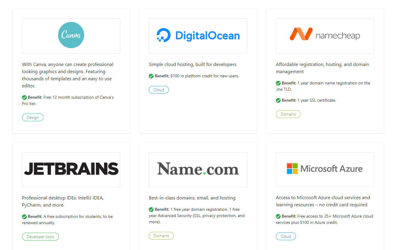 • Jetbrains: Student Licenses of professional desktop IDEs such as IntelliJ IDEA, PyCharm, and more.