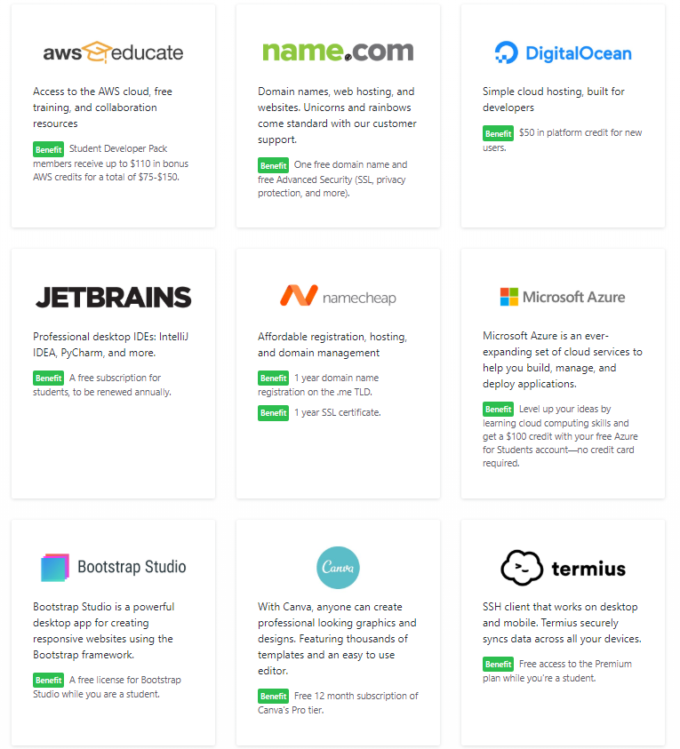 Github Education Pack provides a variety of benefits from its partnerships with software companies across the globe. The pack offers almost $45,000 worth of products and licenses for free to students. They are listed below:-